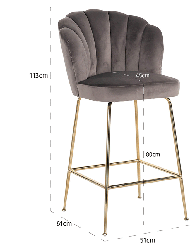 De Richmond barstoel Pippa stone (grijs) velvet, is een prachtige elegante barkruk met een rugleuning in een schelpvorm. De barstoel Pippa is gestoffeerd in een mooie muisgrijs fluweel stof en heeft slanke goudkleur poten. Merk Richmond interiors. Lees meer..